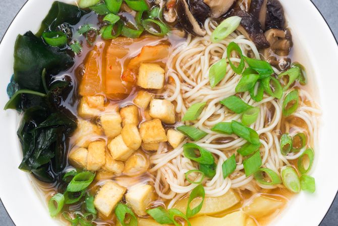 - Poslužite ramen tako što u dublju činiju dodate nudle iz čorbe, pa malo kukuruza (iz konzerve), kockice pečenog tofua i sve to prelijete sa tečnošću iz šerpe.